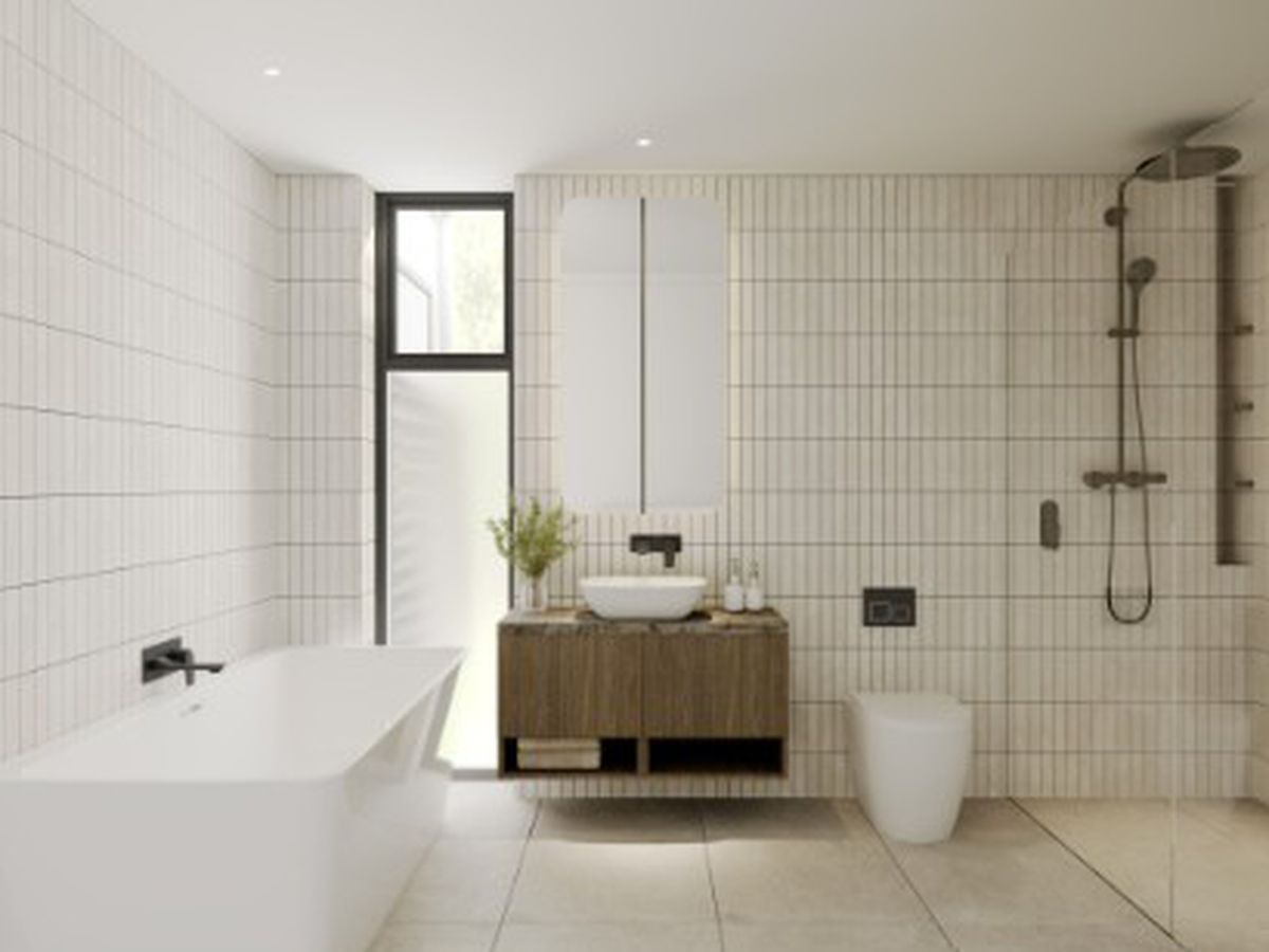 Bathrooms feature natural stone benchtops, statement wall tiling, and premium black fixtures from the EXON range, including mixers, towel rails, and toilet roll holders. Frameless shower screens and the option for freestanding baths in selected residences add to the sense of luxury.